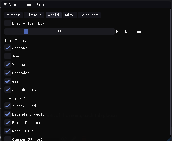 - Set your Loot ESP distance to 100m to keep your screen clear during fights.